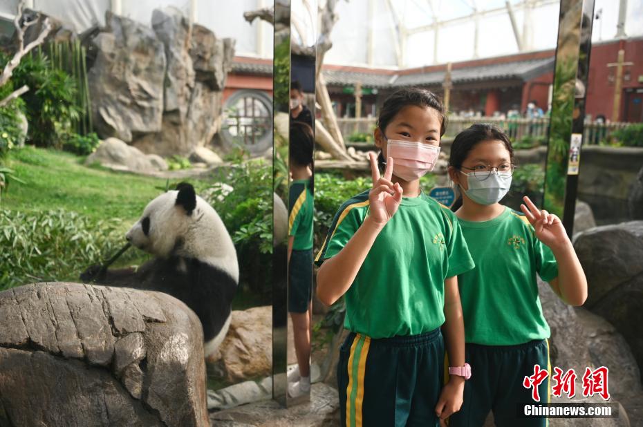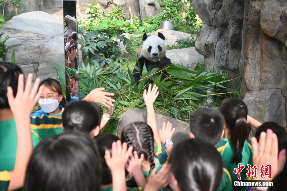 学生向大熊猫乐乐挥手。(图片来源:中新网)