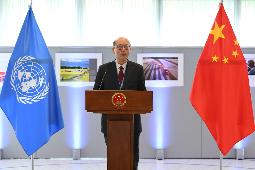 26日,在瑞士日内瓦,中国常驻联合国日内瓦办事处和瑞士其他国际组织代表陈旭在“新疆是个好地方”图片展开幕式上讲话。(图片来源:本文图片均自新华社)