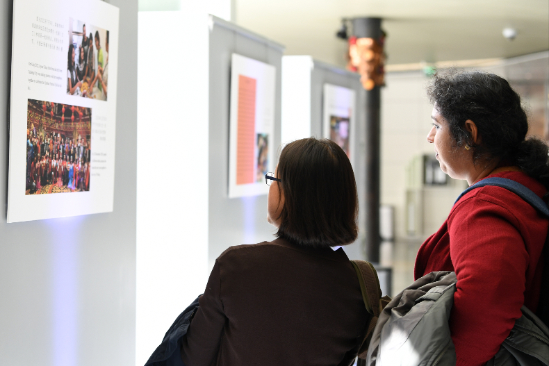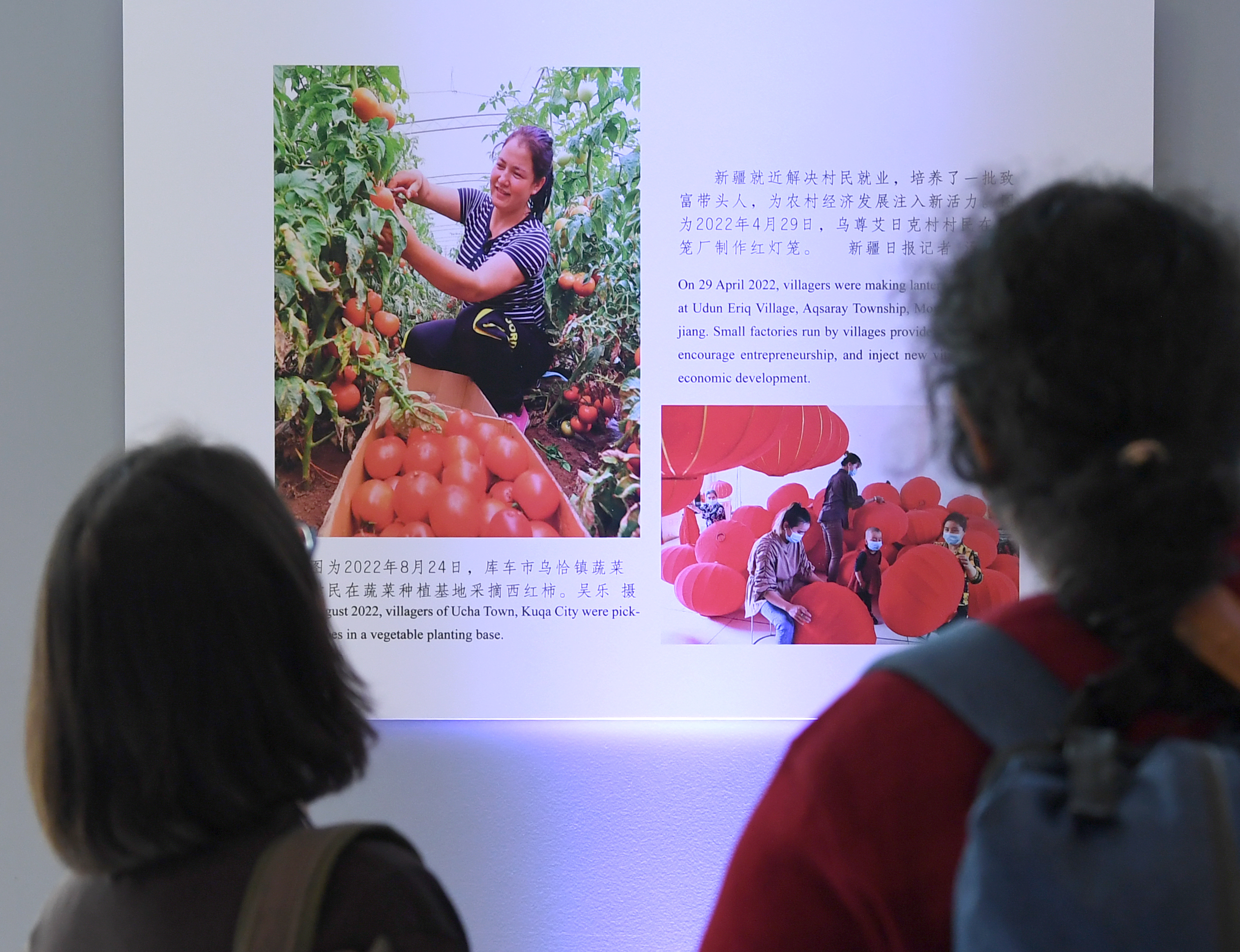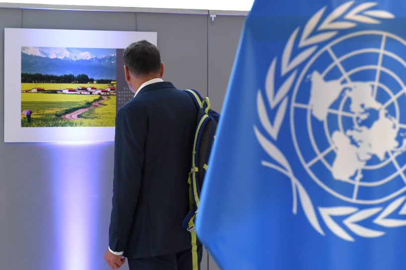9月26日,在瑞士日内瓦,嘉宾观看“新疆是个好地方”图片展。