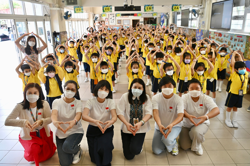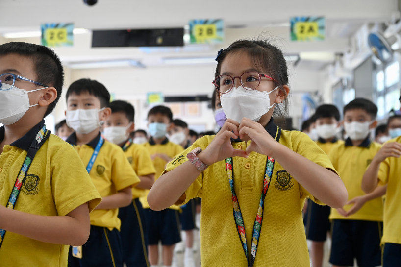 国庆节将近,9月28日,粤港澳大湾区文化艺术发展协进会举行《国家》手语舞进校园活动,与香港保良局林文灿英文小学的师生们一起学习和展示《国家》手语舞,展现了香港学生的精神风貌,表达浓浓的家国情怀,喜迎新中国成立73周年。图为小学生做出爱心手势。(图片来源:中新社)