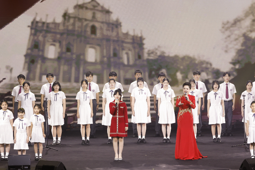 9月25日,澳门举行文艺晚会献礼国庆喜迎党的二十大。图为女高音歌唱家王庆爽携手澳门学生,带来京剧艺术和童声合唱完美结合的《七子之歌》。(图片来源:新华社)