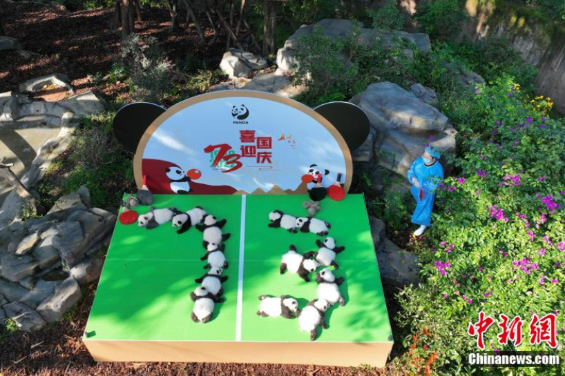9月28日为庆祝新中国成立73周年以及预祝成都世乒赛举办成功,成都大熊猫繁育研究基地内十余只2022级新生大熊猫宝宝一起亮相太阳产房。图为在乒乓球桌样式的亮相台上,饲养员将大熊猫幼仔排成“73”的字样。(中新网发/成都大熊猫繁育研究基地供图)