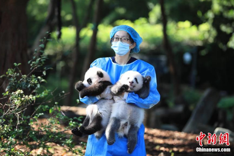 此次新生大熊猫集体亮相活动融合了国庆以及乒乓球元素。图为饲养员抱着大熊猫宝宝。(中新网发/成都大熊猫繁育研究基地供图)