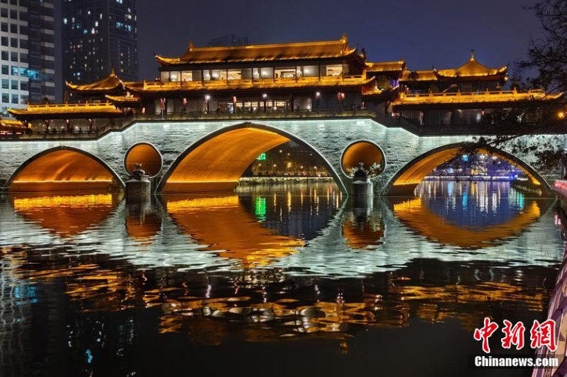锦江夜行、锦江夜恋、国风集市等丰富多彩的活动带动锦江两岸夜间经济发展,共同点亮锦江沿线夜间烟火气。跌宕起伏的音乐效果和婀娜多姿的汉服表演,将游客拉入梦幻绚丽的千年画卷中。(图片来源:中新网)