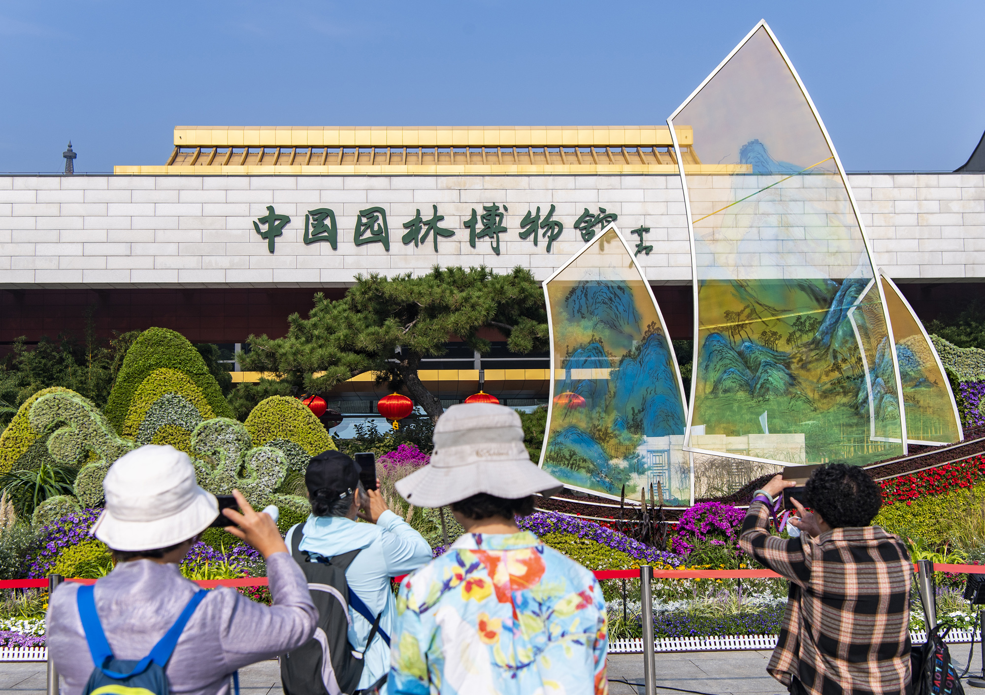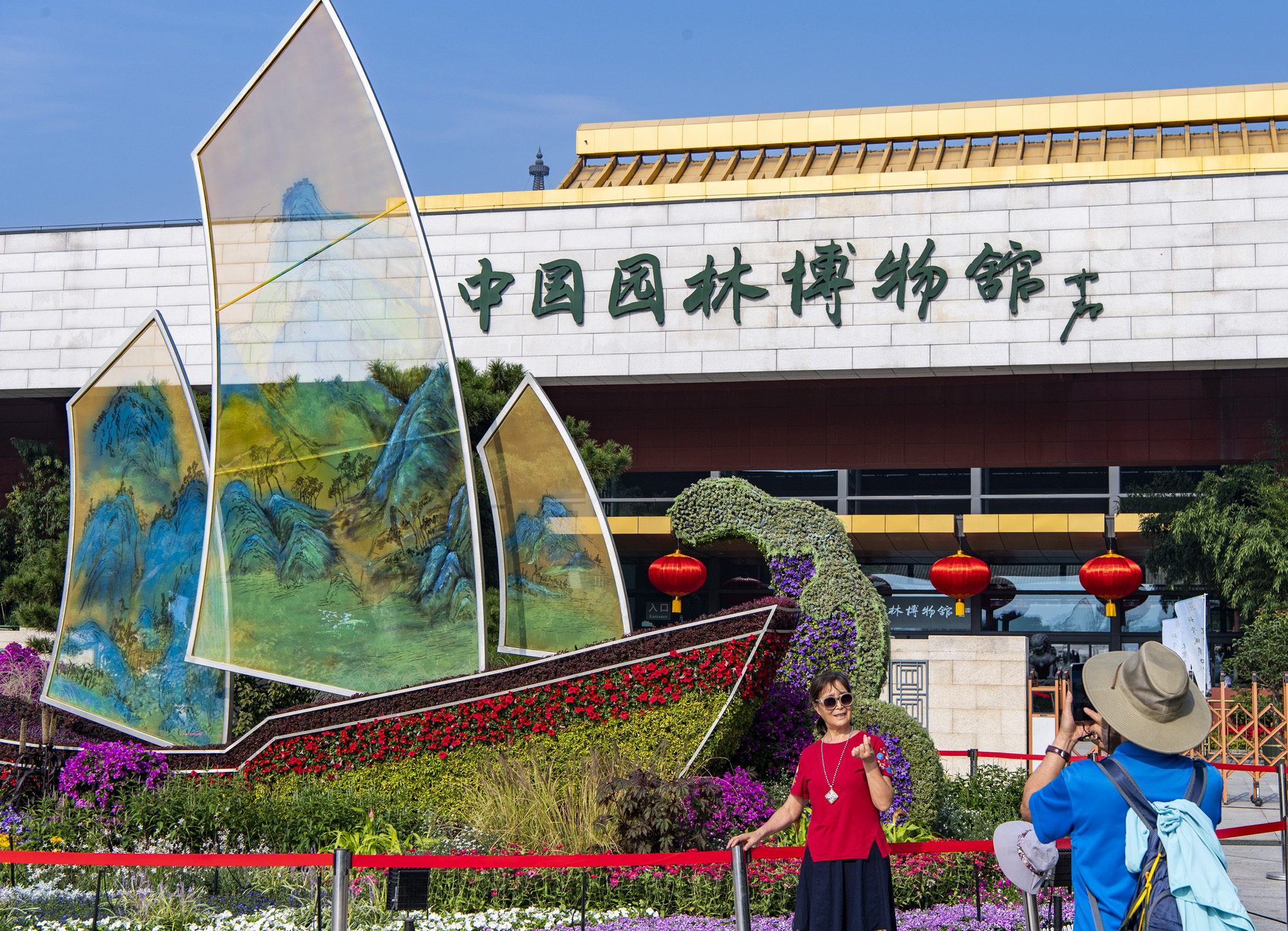 9月28日,位于北京市丰台区的中国园林博物馆入口处布置的迎接国庆、融合“千里江山图”和“扬帆起航”元素的主题花坛吸引游客拍照留念。(图片来源:中新社)