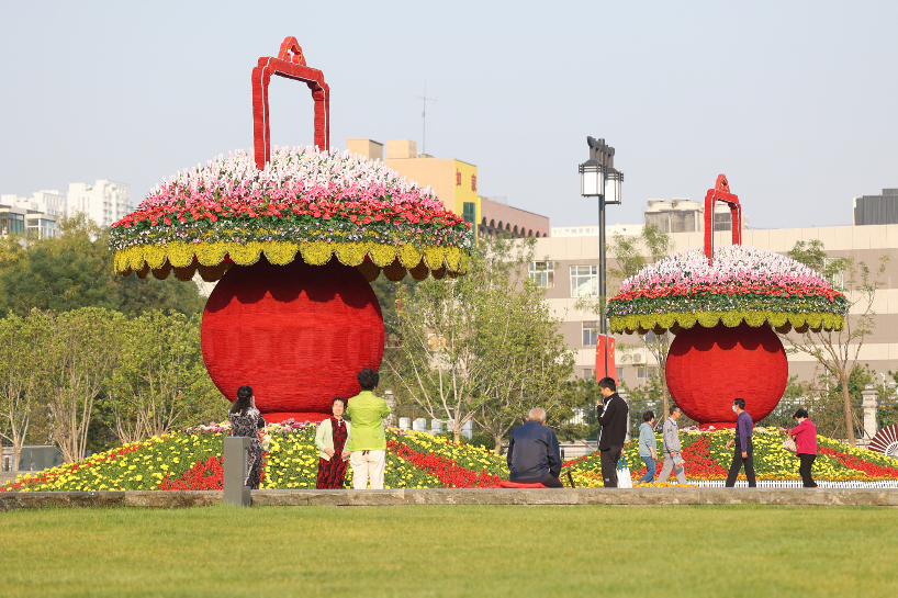 中国园林博物馆布置主题花坛迎接国庆。(图片来源:中新社)