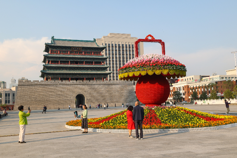 国庆主题花坛扮靓太原街头。(图片来源:中新社)
