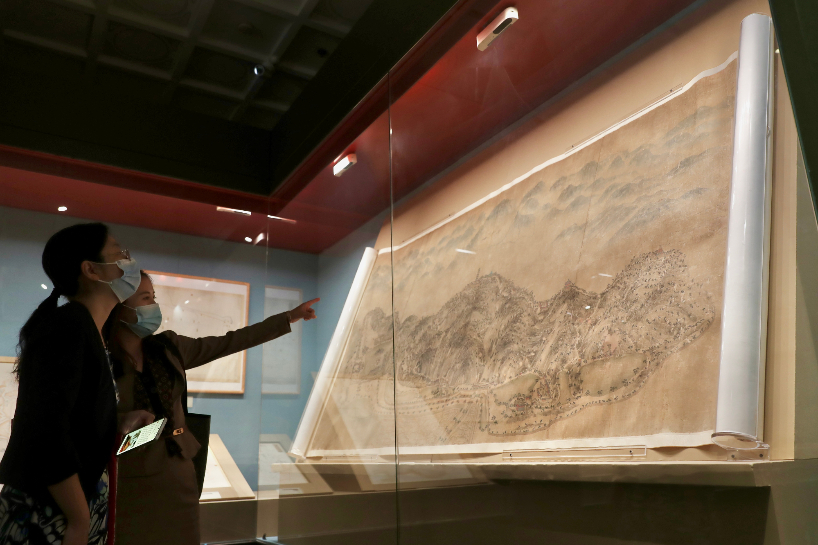 9月28日,精品文物专题展“园说Ⅳ——这片山水这片园”在颐和园博物馆开幕。图为观众在参观清代《玉泉山风景图》。(图片来源:中新社)