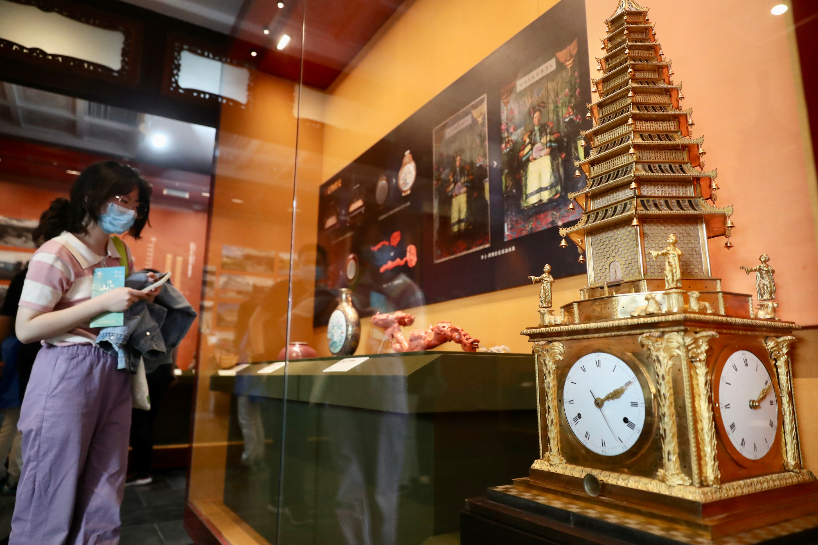 园说Ⅳ汇集了颐和园、故宫博物院、国家图书馆等15家文博单位提供的各类展品171件/套、资料品32件/套,系统讲述以三山五园为核心的历史名园集群在选址、营建、造园艺术、历史功能及保护发展等方面的内容。图为铜镀金塔式座钟。(图片来源:中新社)