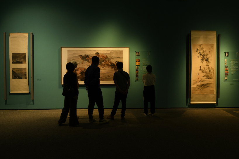 9月28日,重庆,“星汉灿烂:中国现代美术在重庆(1937-1949)”作品展在四川美术学院美术馆开幕,齐白石、张大千、徐悲鸿等名家作品亮相。图为精美画作吸引市民参观。(图片来源:中新社)