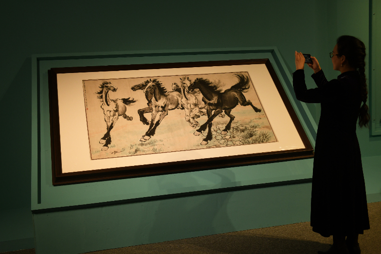 徐悲鸿《群奔》吸引参观者拍照留念。(图片来源:中新社)
