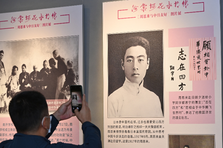 首展之后,该展览将在中国淮安和日本京都、中国广州和日本仙台同期展出。图为北京会场内,一名观众拍摄青年周恩来的展览图片。(图片来源:中新社)