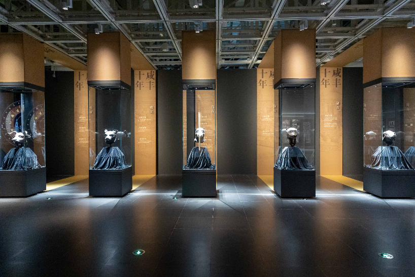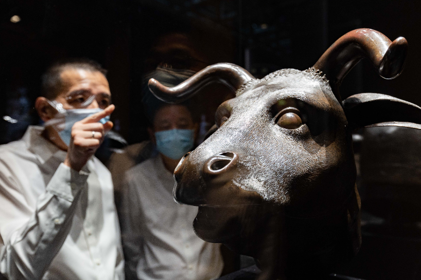 展品包括清代圆明园海晏堂十二生肖之牛首、虎首、猴首、猪首青铜兽首原件、马首复制件,以及商周、春秋战国、两汉时期国宝级青铜重器。图为观众在观看展出的牛首。(图片来源:新华社)