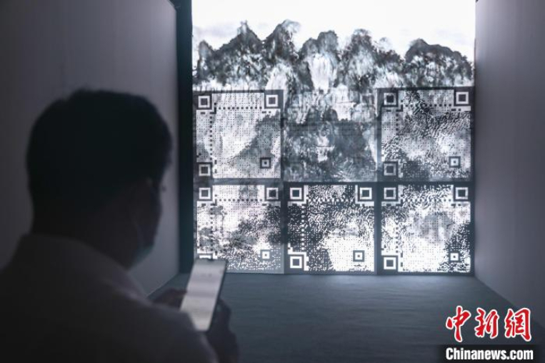 该展览将持续至2023年1月4日,展览结束后,将利用360°全景VR技术手段把本次展览制作为云展览,永久保留供观众线上观看。图为一位市民使用手机扫描墙上的数字新媒体作品《人工智能山水图》里的二维码之后,在阅读相关内容。(图片来源:中新网)