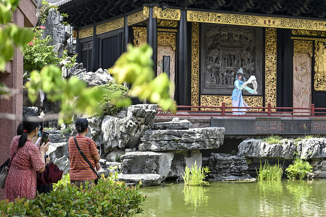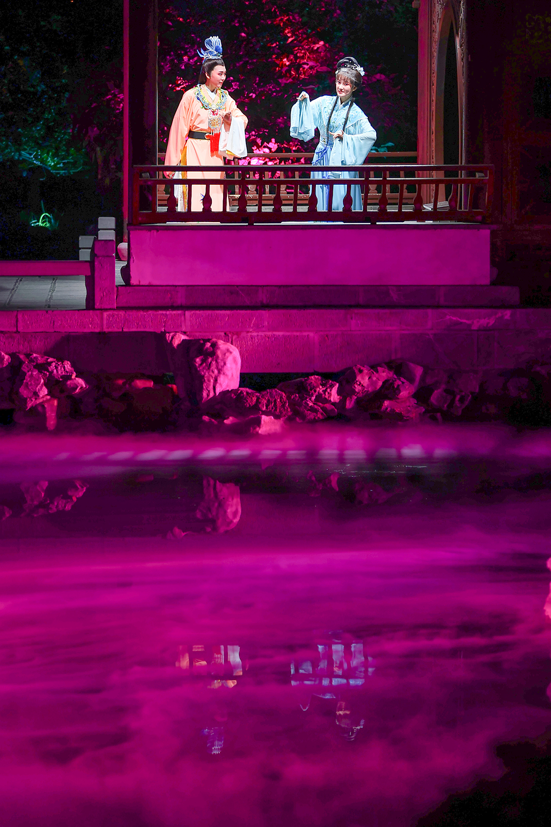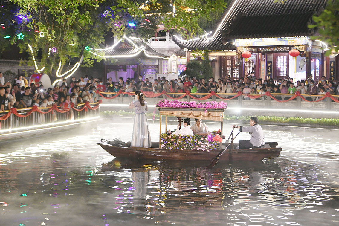10月2日晚,有着600多年历史的南京古典园林瞻园内上演“金陵寻梦·夜瞻园”沉浸式演出。图为演员们表演节目。