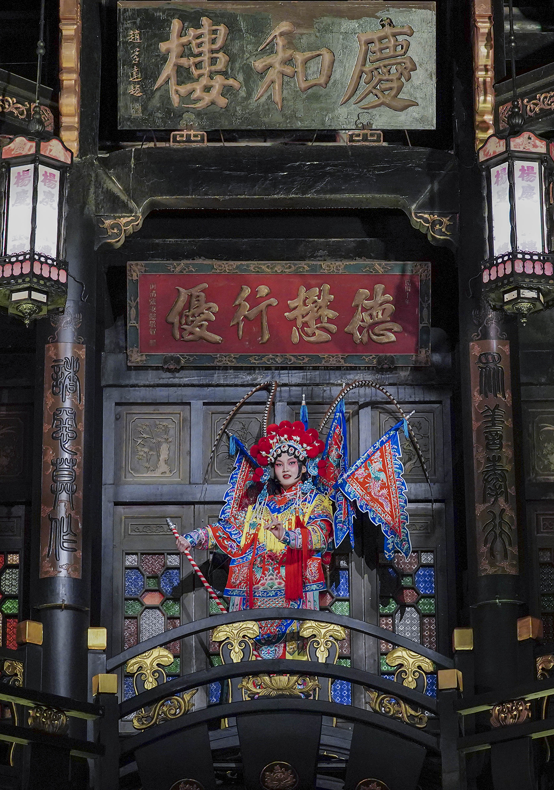 10月2日,在重庆千年古镇磁器口后街的“戏韵国潮馆”内,演员在台上表演川剧。(图片来源:新华社)