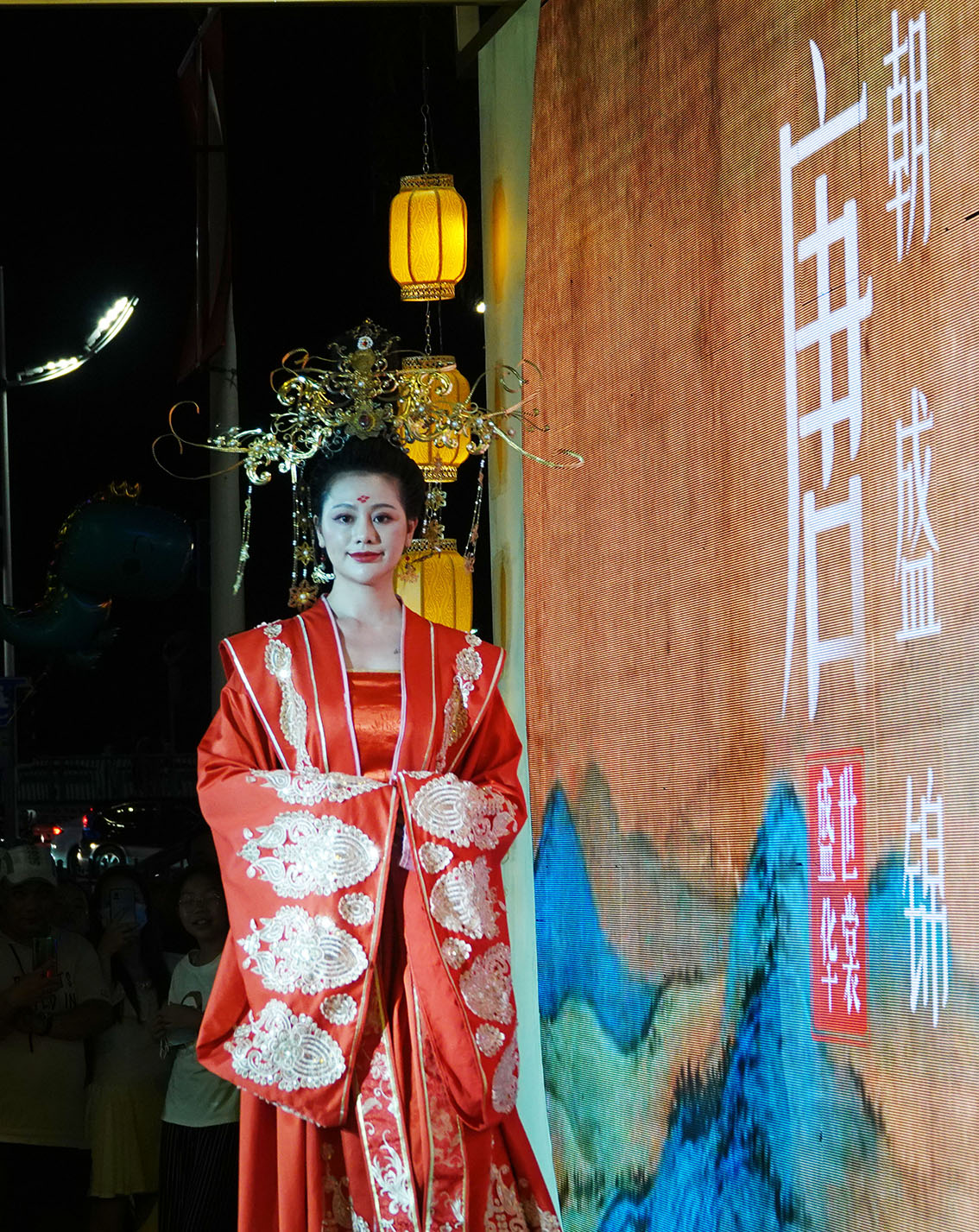 10月1日晚,演员在南宁市“三街两巷”历史文化街区进行“唐朝制式汉服走秀”表演。