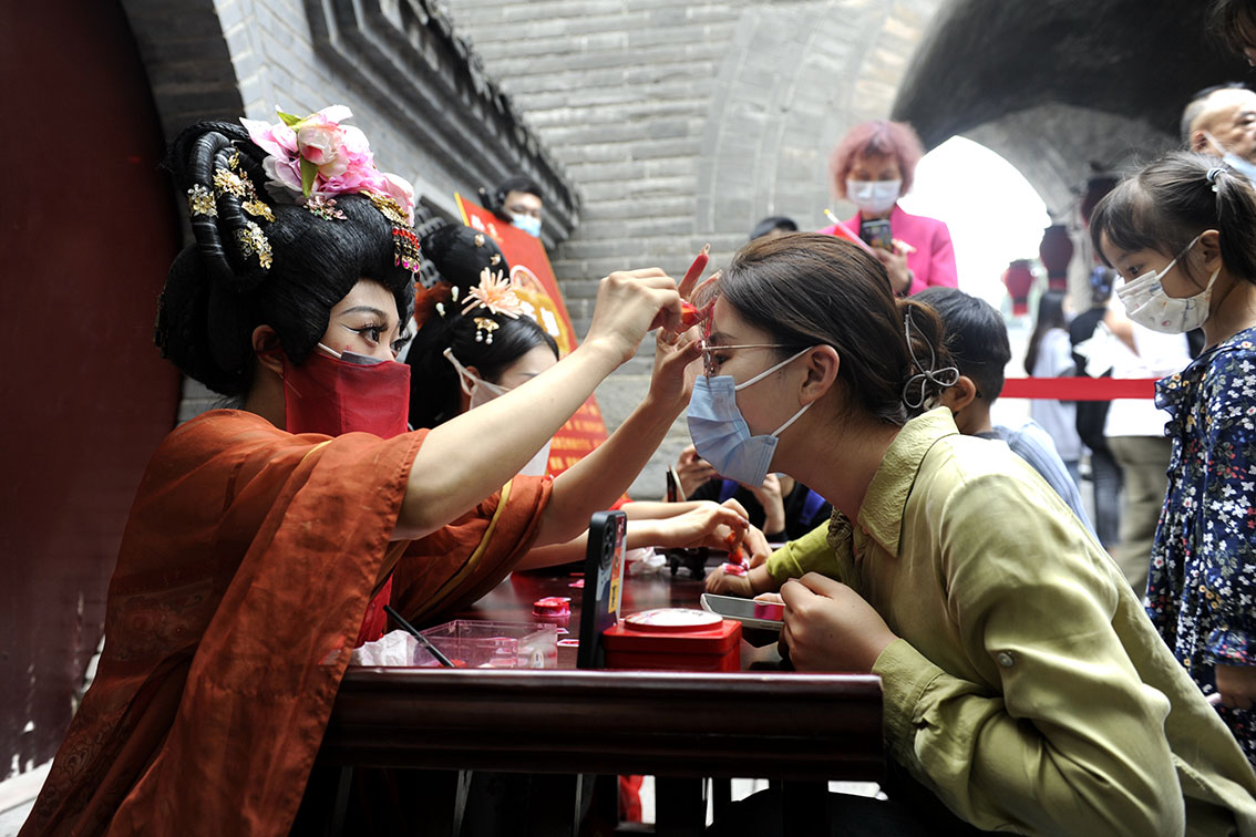 10月1日,陕西西安,工作人员正在为市民点缀花钿。当日,西安城墙举行嗨FUN国庆•潮玩在WALL——2022西安城墙国庆主题系列活动,将金甲武士、盛唐天团等景区IP融入国庆主题文艺汇演活动中,让市民游客在古城西安感受盛唐魅力。
