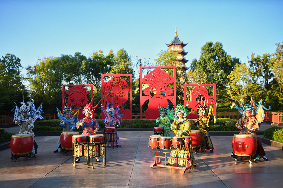 10月1日,正值国庆假期首日,长沙方特的京剧表演者们敲响战鼓《秦王破阵鼓》,向前来的游客展示国粹京剧的魅力。图为多位京剧表演者击打战鼓。