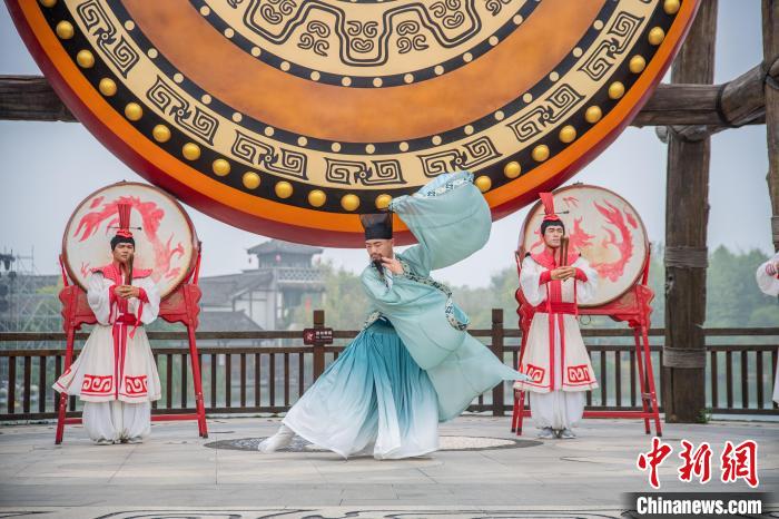 10月3日,在江苏省常州市茅山脚下的江南山镇东方盐湖城里,游客们沉浸式体验古人的生活百态。图为晨钟暮鼓表演。(图片来源:中新网)