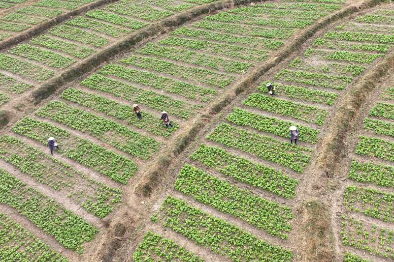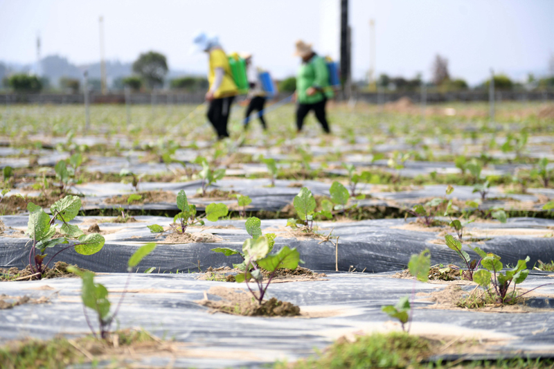 10月6日,农民在贵州省榕江县古州镇车江大坝蔬菜基地管护蔬菜。(图片来源:新华社)