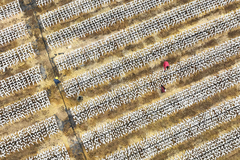 10月6日,村民在贵州省黔东南苗族侗族自治州岑巩县水尾镇新场村黑木耳基地劳作。(图片来源:新华社)