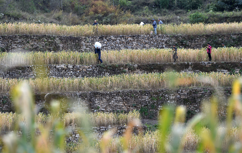 10月6日,河北省石家庄市井陉县辛庄乡焦家垴村农民在梯田里抢收谷子。(图片来源:新华社)