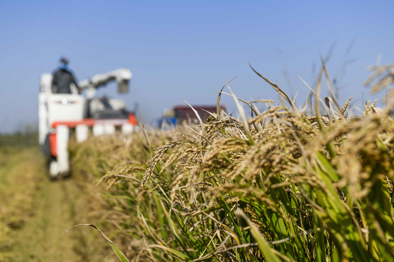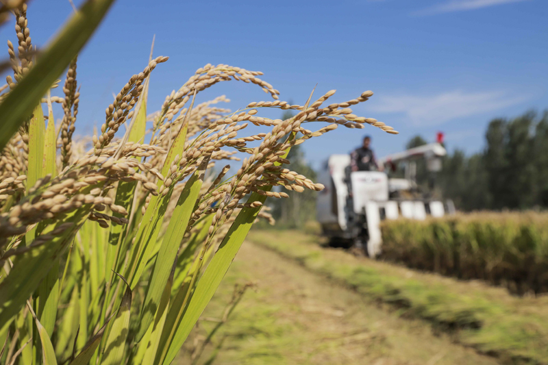 10月6日,农民在河北省唐山市海港经济开发区王滩镇驾驶收割机收获水稻。(图片来源:新华社)