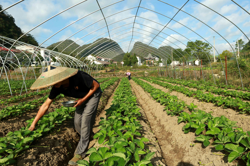 10月6日,贵州省黔南布依族苗族自治州平塘县牙舟镇卡罗村的村民在管护草莓苗。(图片来源:新华社)