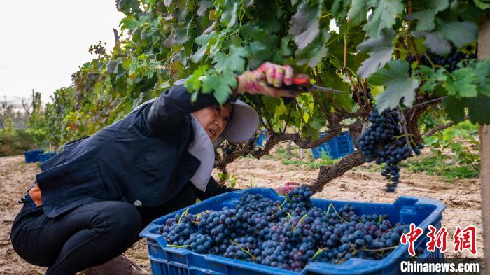 10月5日,山西省临汾市乡宁县葡萄种植园内,果农深入田间采摘葡萄。(图片来源:中新网)