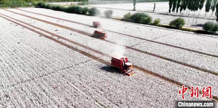新疆阿克苏地区740万亩棉花迎来采收季。10月5日,阿克苏市大型采棉机在棉海里来回穿梭,经过一番“吞云吐雾”,“生产”出成型的棉包。(图片来源:中新网)
