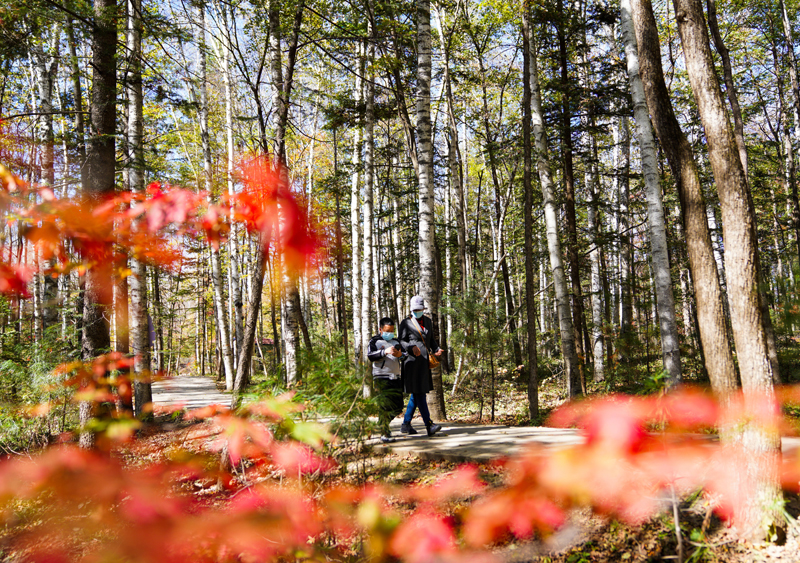 10月5日,游人在吉林红石国家森林公园内游览。(图片来源:新华社)