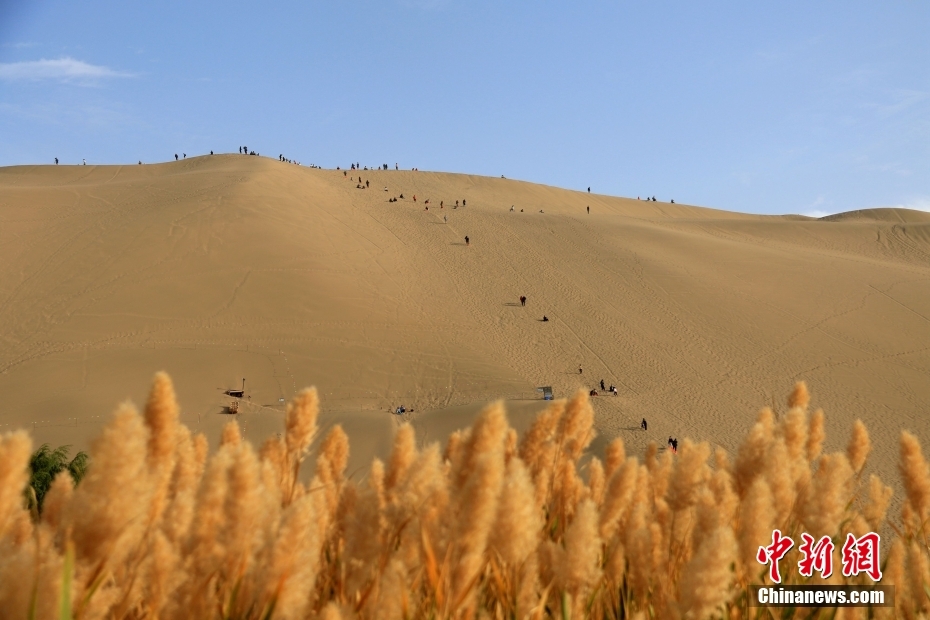 10月4日,游客在甘肃省敦煌市鸣沙山月牙泉景区游览。(图片来源:中新网)