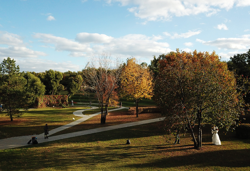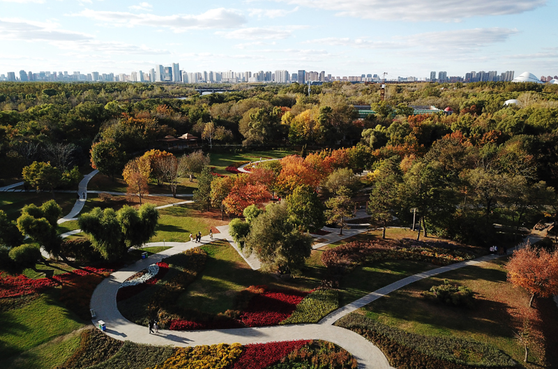 10月4日拍摄的哈尔滨太阳岛风景区的花卉园(无人机照片)。(图片来源:新华社)