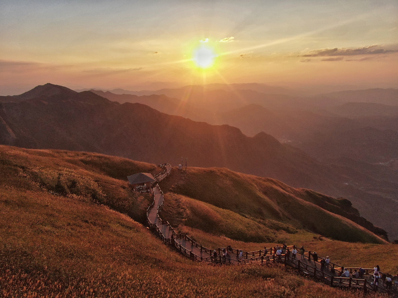 10月3日,中国传统节日重阳节将至,又恰逢国庆假期,不少游客来到武功山登高游玩。(图片来源:中新社)