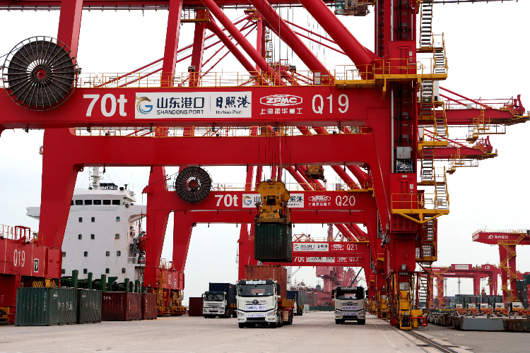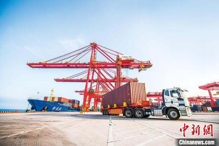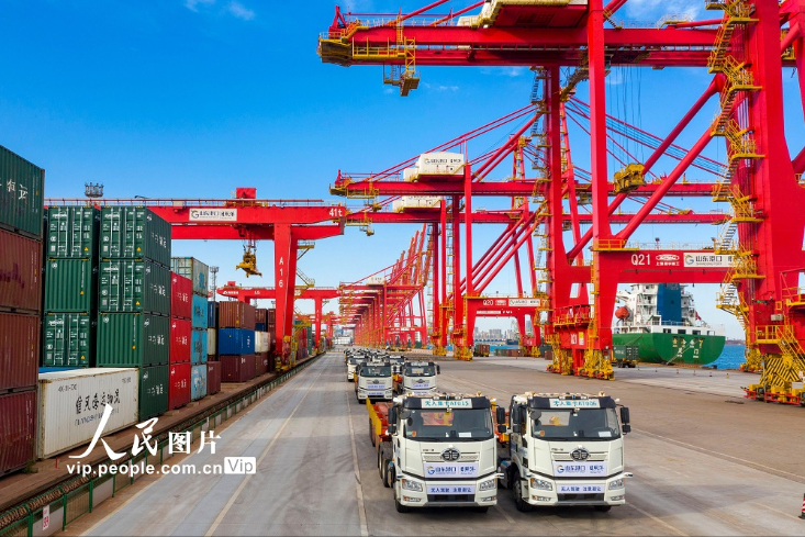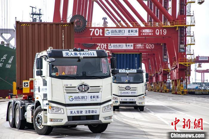 资料图为山东港口日照港顺岸开放式全自动化集装箱码头无人集卡正在作业中。(图片来源:中新网)