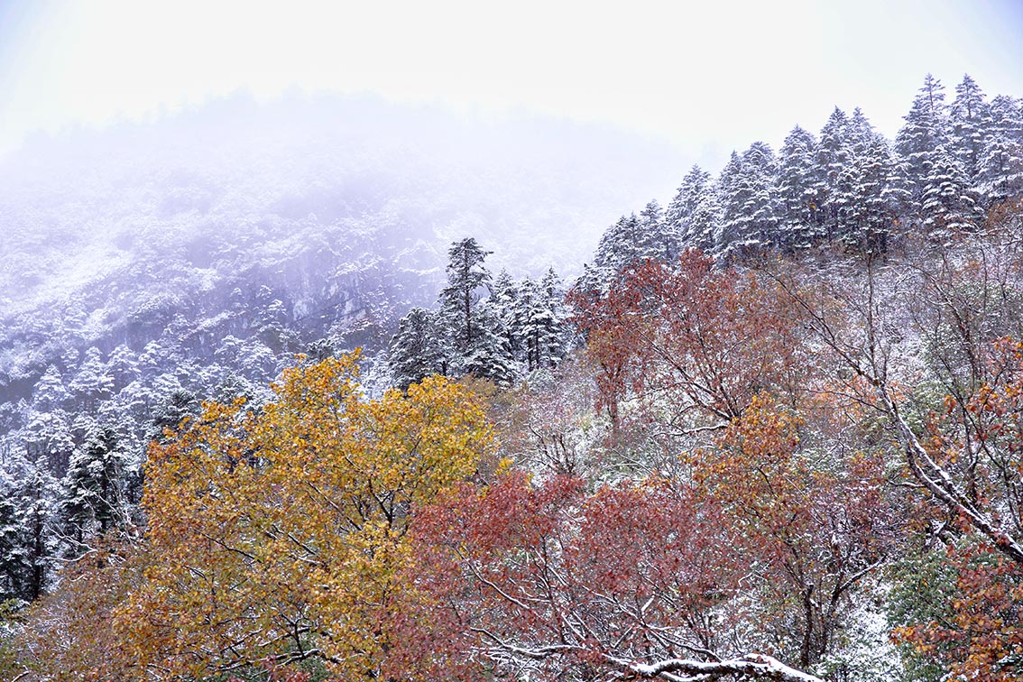 10月10日拍摄的天桥沟森林公园雪景。10月10日,辽宁省丹东市天桥沟森林公园迎来降雪,在雪色的映衬下,多彩的秋叶斑斓绚丽。(图片来源:新华社)
