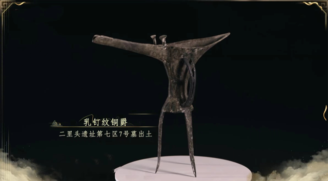 《中国考古大会》节目中设置了由三位青年考古爱好者组成的“考古推广团”,他们在探秘空间环节了解了二里头文化中的礼器。铜爵是二里头文化最核心的礼器,“华夏第一爵”——乳钉纹铜爵是二里头遗址目前所出土青铜爵中最具代表性的,因其外形“细腰长腿”,也有“美人爵”的称号。