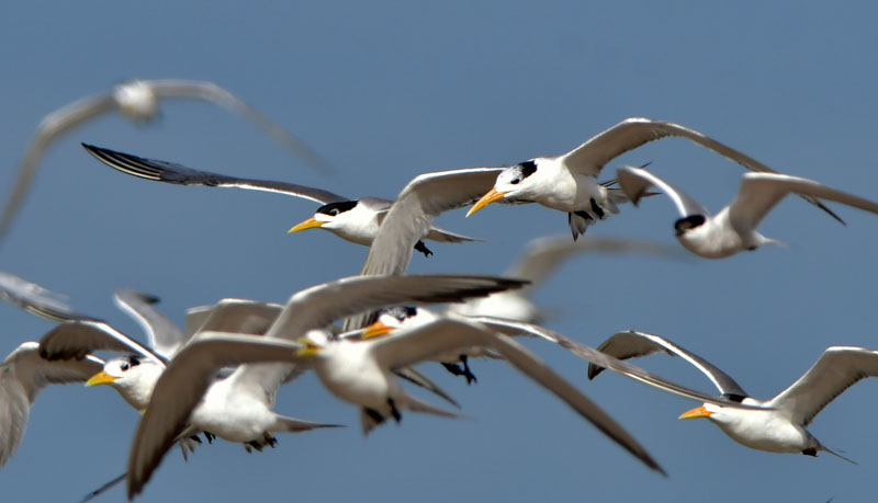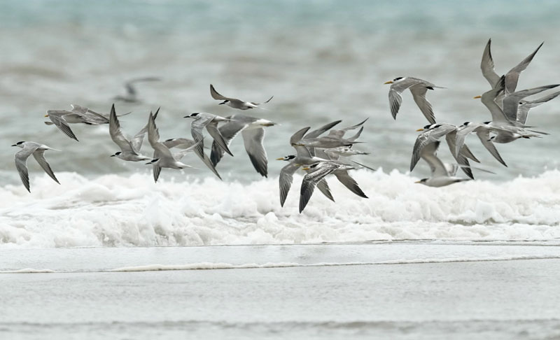 一群大凤头燕鸥在闽江河口湿地上空飞行觅食。闽江河口湿地地处福州市马尾区东南部与长乐区东北部交界处的闽江入海口区域,是东亚-澳大利亚候鸟迁徙通道上的重要驿站,名副其实的“鸟类王国”。(图片来源:新华社)