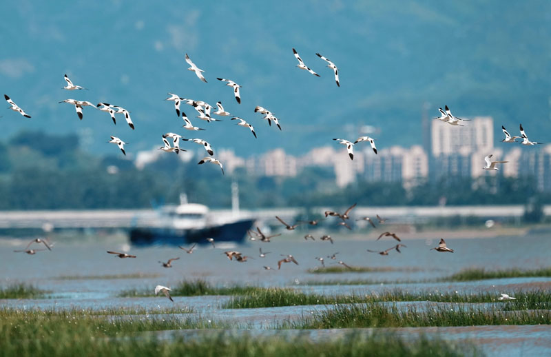 在闽江河口湿地,翱翔的鸟群与作业的渔船相映成画。(图片来源:新华社)