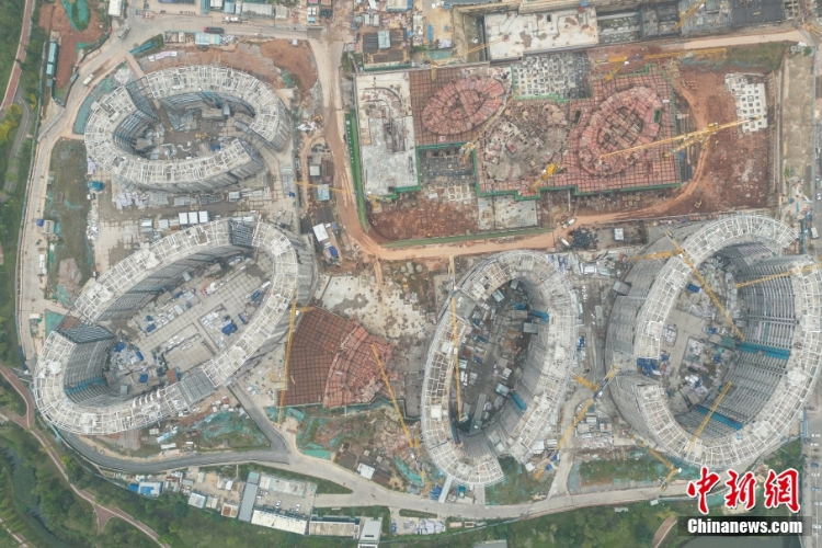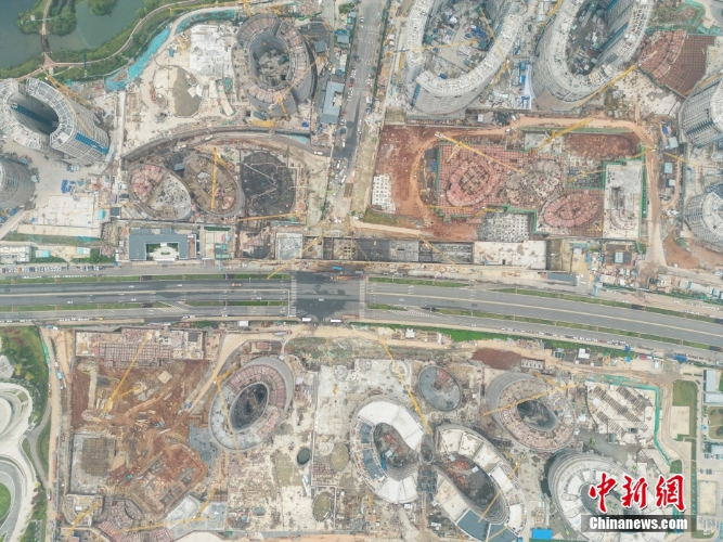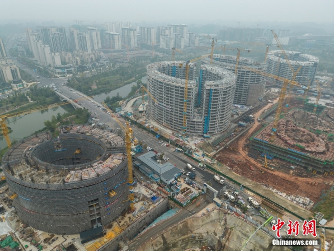 航拍建设中的四川天府新区独角兽岛园区。(图片来源:中新网)