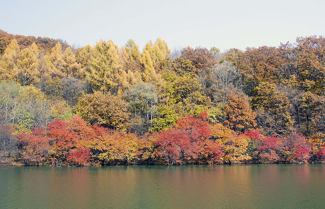 2022年10月15日,吉林省吉林市,松花湖两岸枫叶火红,景色怡人。