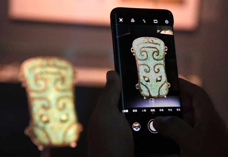 资料图为参观者在“中国百年百大考古发现展”上拍摄展品二里头“镶嵌绿松石兽面纹铜牌饰”。(图片来源:新华社)