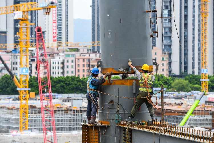 8月4日,建设者在广州白云火车站二期工程施工现场吊装钢结构叠合柱。(图片来源:新华社)