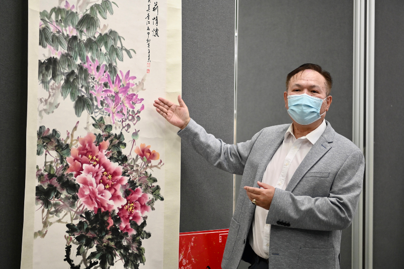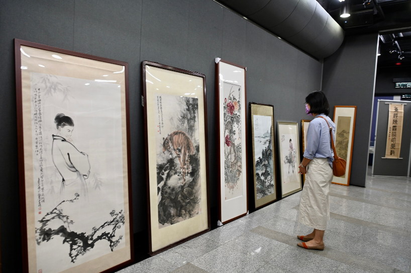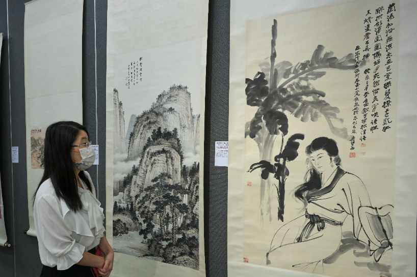 10月13日,由中国社会经济文化交流协会、中国香港文化体育旅游协会主办的“庆祝中华人民共和国成立73周年香港美术家、收藏家—春风万里书画展”于香港上环文娱中心展厅举行开幕仪式,吸引市民到场参观。图为市民观赏书画作品。(图片来源:中新社)