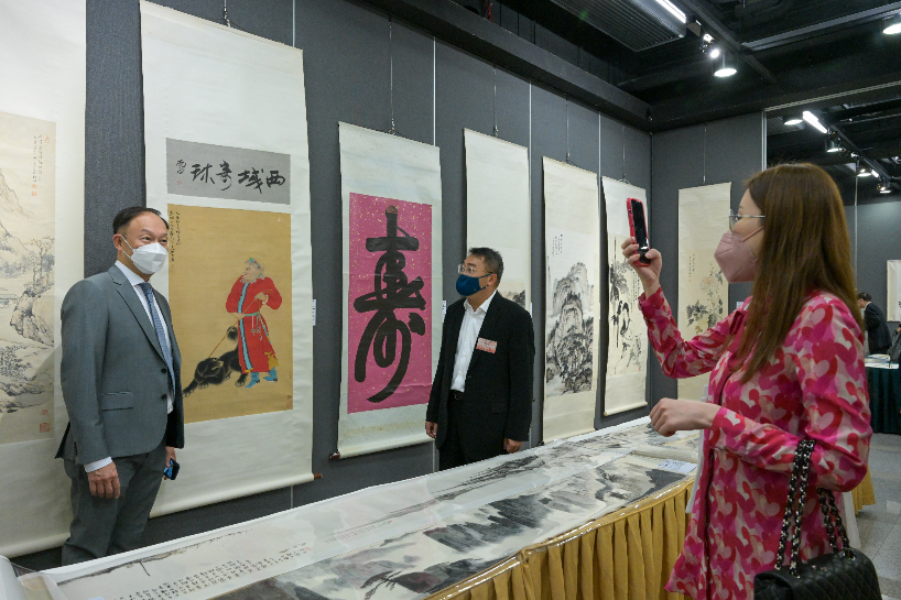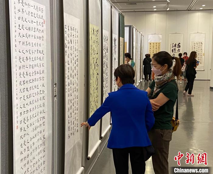 由中国书协香港分会主办的香港书法界大联展2022暨“文联杯”全港中小学书法比赛获奖作品展18日在香港中央图书馆开幕,展出来自香港、澳门及内地多名书法家逾260幅书法作品,以及该比赛得奖作品。图为入场人士观赏书法作品。(图片来源:中新网)