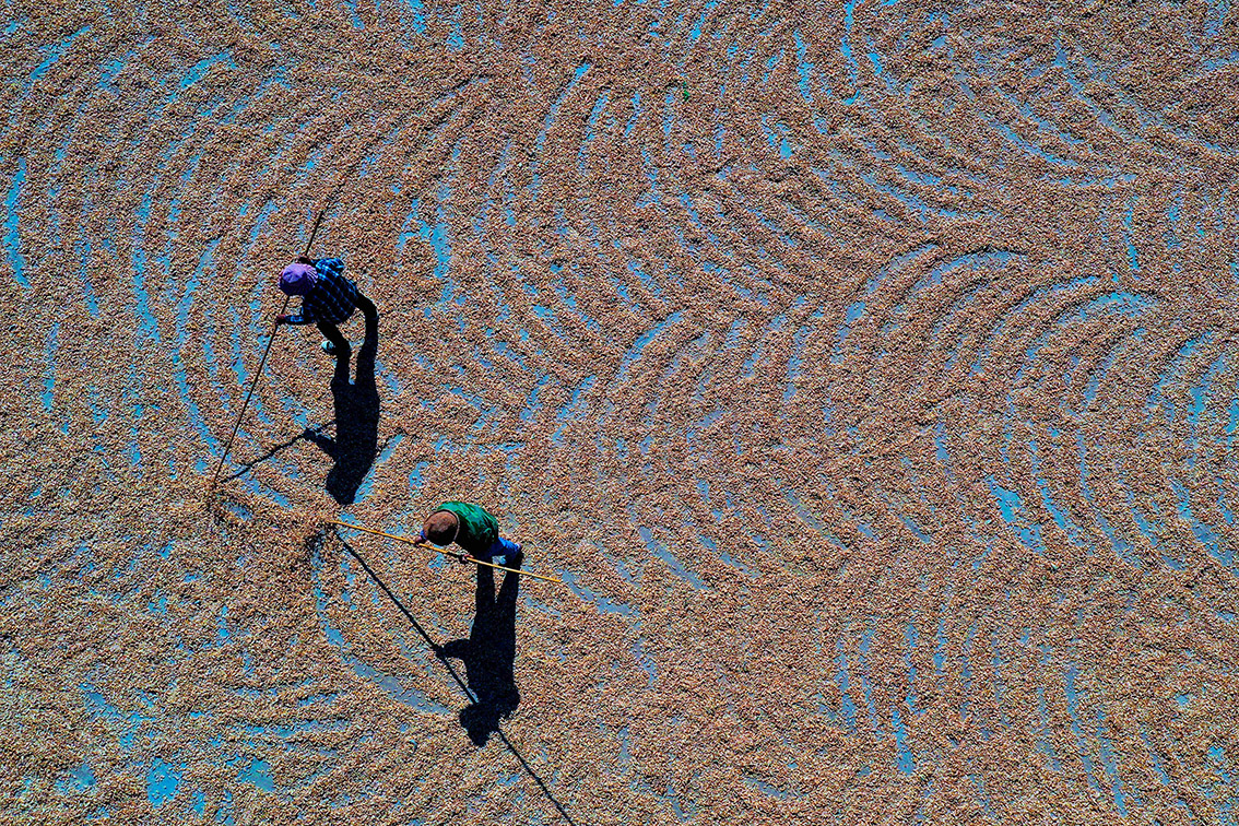10月19日,渔民在山东日照岚山区胡家林村晾晒海米。(无人机照片)(图片来源:本文图片除标注外均自中新社)