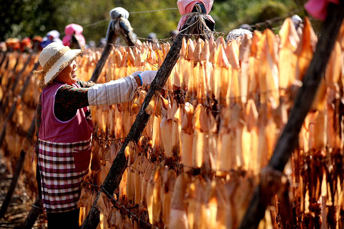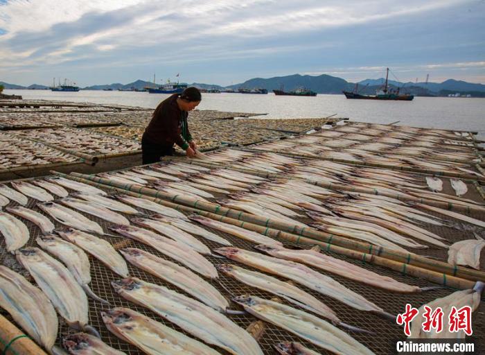 10月11日,浙江省宁波市象山县石浦镇,渔嫂晒制鱼鲞现场。(图片来源:中新网)