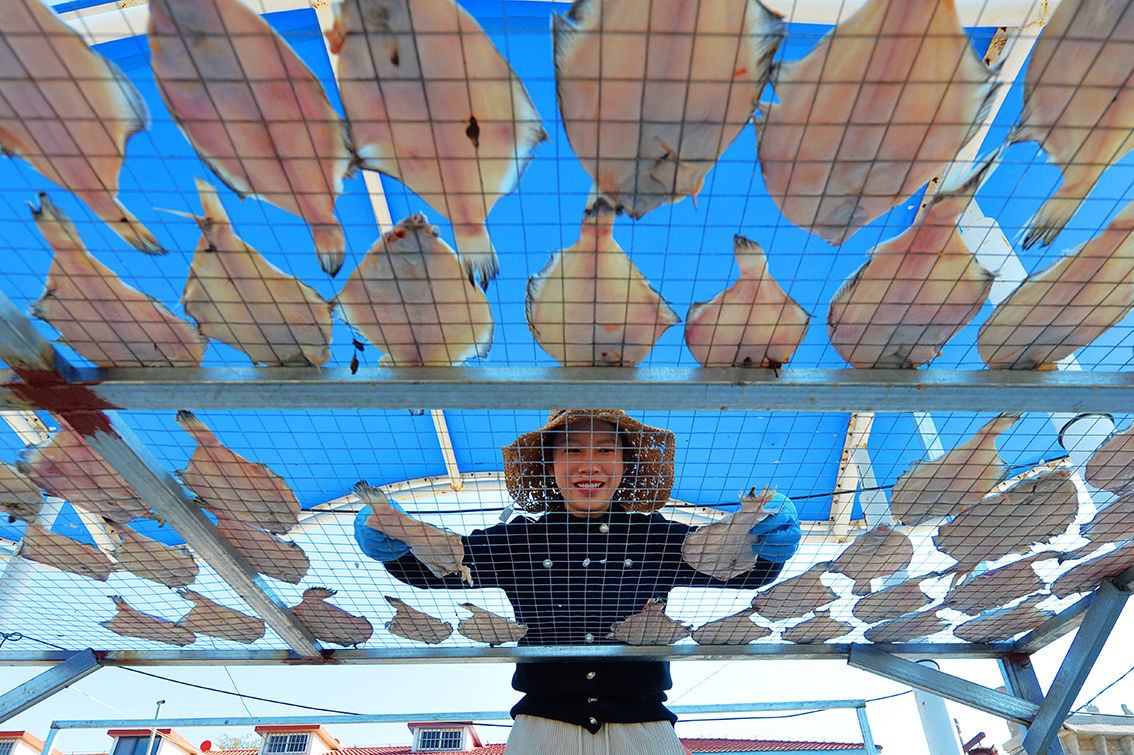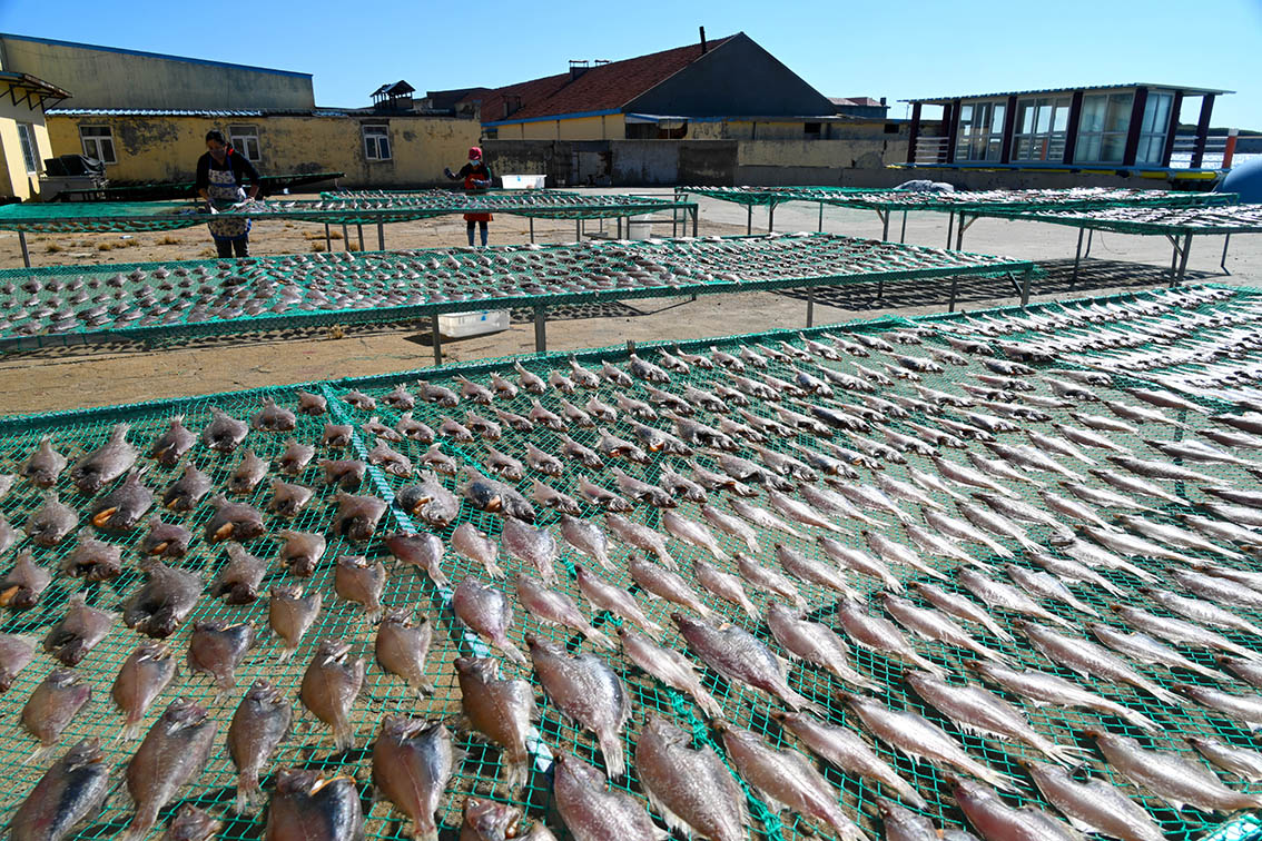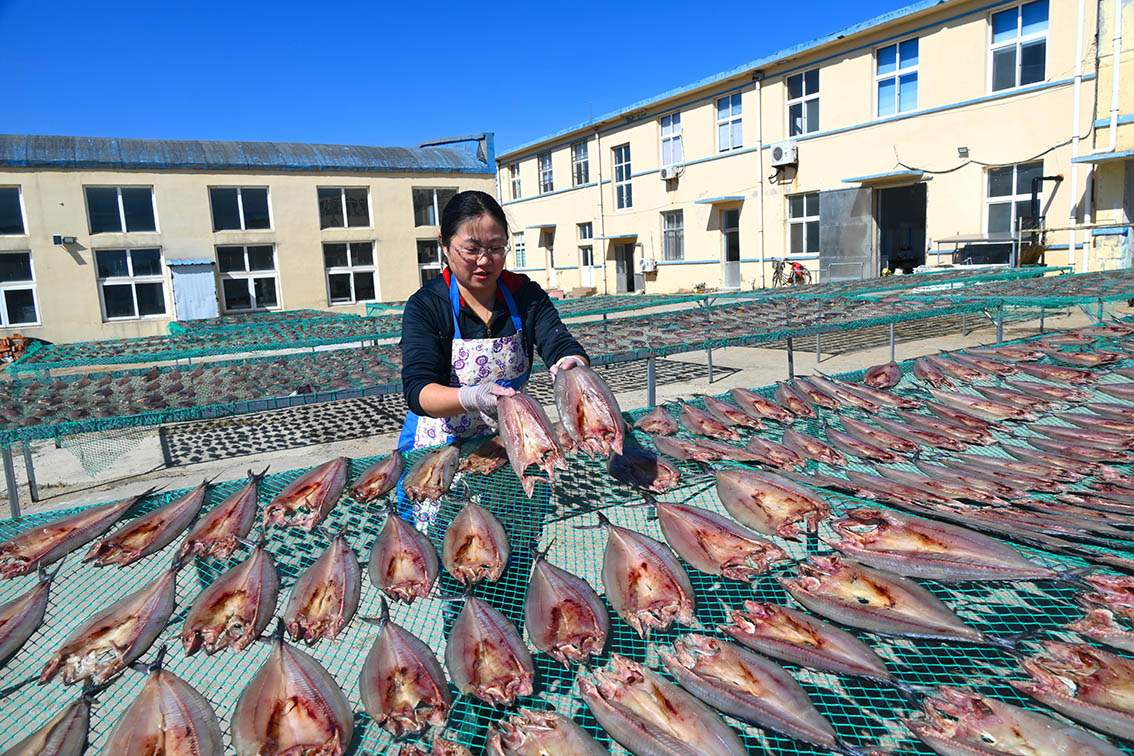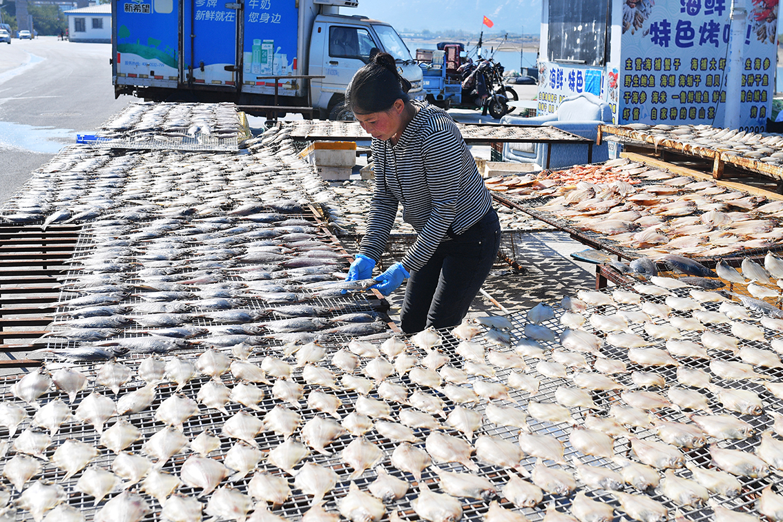 2022年10月11日,许多胶东人家晒起了海鱼干。胶东沿海渔家百姓通过对海鲜鱼清理、腌制、晾晒、海水冲洗、捂制等方式制成的鱼干,在成为地方独具特色的美味食品,受到市场青睐,成为渔民致富的好门路。
