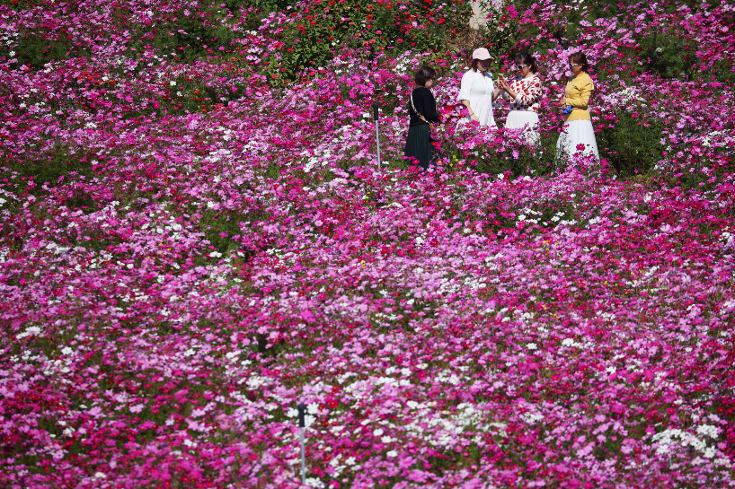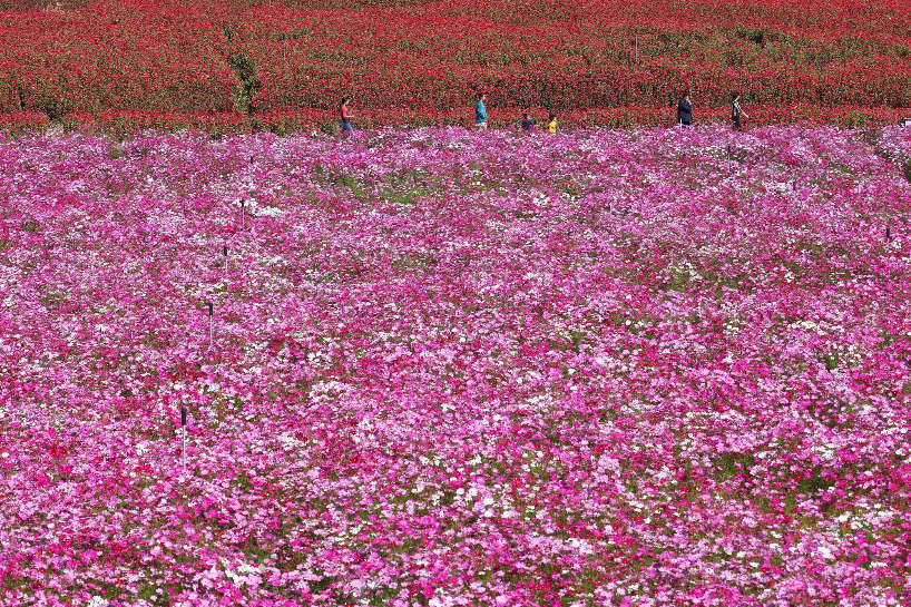 19日,南京市六合区冶山一处山坡上,百日菊、波斯菊等花朵竞相绽放、层层叠叠,红、白、黄相间,连绵成片,蔚为壮观。(图片来源:本文图片除标注外均综编自中新社)